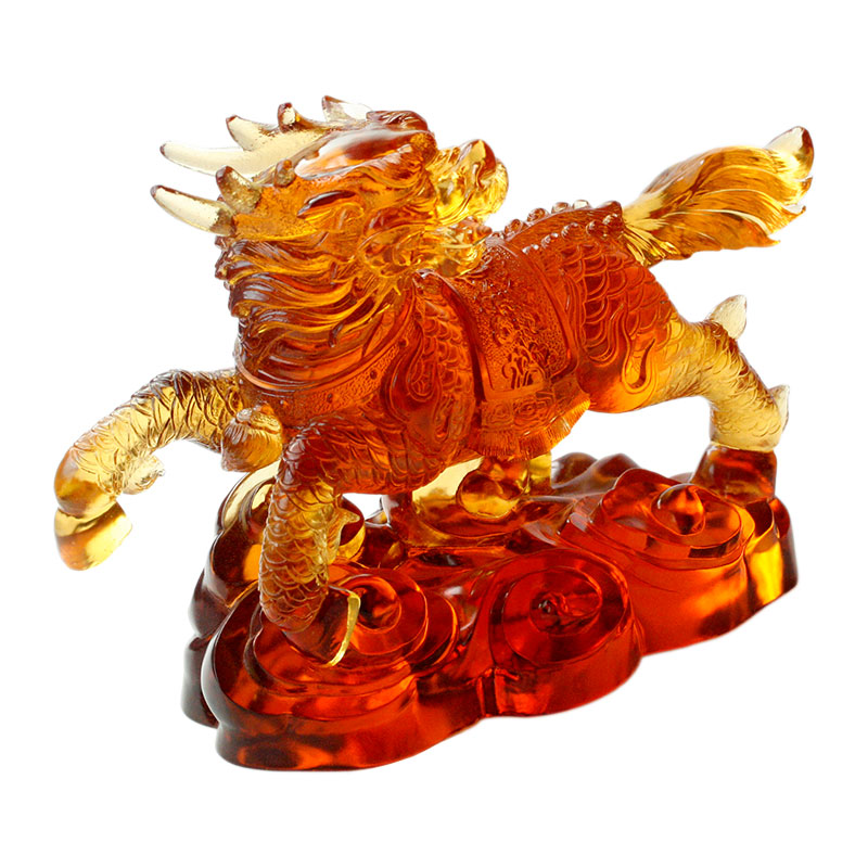 এই কাঁচের জন্তুটির আকৃতি প্রাণবন্ত, এবং প্রতিটি বিবরণ খুব সূক্ষ্মভাবে চিত্রিত করা হয়েছে, জন্তুটির মুখের অভিব্যক্তি থেকে শুরু করে শরীরের পেশীর রেখা এবং লেজের মার্জিত ভঙ্গি পর্যন্ত, যা সবই কারিগরের দুর্দান্ত দক্ষতা দেখায়। এই কাচের জন্তু একটি উষ্ণ এবং স্তরযুক্ত স্বন গ্রহণ করে। অ্যাম্বার রঙ এটিকে একটি মহিমান্বিত এবং গম্ভীর মেজাজ দেয়, যেন এটি একটি প্রাচীন কিংবদন্তি থেকে একটি অভিভাবক পশু। গ্লাসটি আলোর আলোকসজ্জার অধীনে কমনীয় আলোকে প্রতিসরণ করবে, যা এই কাচের প্রাণীটিকে বিভিন্ন কোণে বিভিন্ন ভিজ্যুয়াল প্রভাব উপস্থাপন করে, এর রহস্যময় আকর্ষণ যোগ করে।